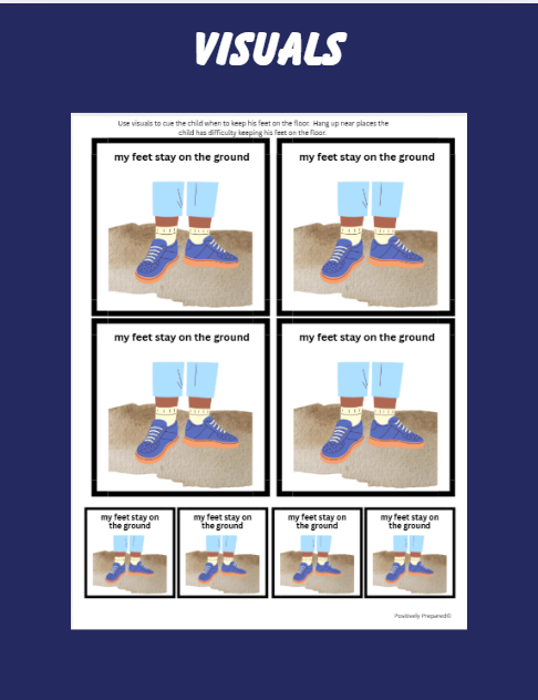 Visuals – picture cards to cue the child to keep her feet on the ground.